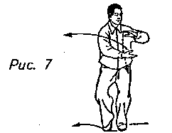 она образовала вместе с левой рукой позицию удержания воображаемого мяча. Одновременно с этим приблизьте правую ногу к левой, держа правый носок прижатым к земле. Вес тела нужно медленно перенести на левую ногу. Взгляд направлен в сторону левой руки (рис. 7).