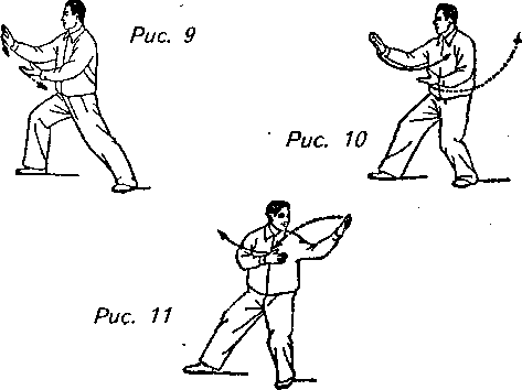 Движение 5: Выставив правую руку вперед ладонью вниз, переместите левую руку ладонью вверх перед животом к правому запястью. Затем отведите обе руки назад, вниз и вперед по окружности до тех пор, пока левая рука, направленная ладонью вверх, не достигнет уровня плеч, а правая, обращенная ладонью к внутренней стороне, не окажется перед грудью. Одновременно с этим медленно переместите центр тяжести тела на левую ногу. Это движение называется “откат назад” (рис. 9, 10, 11).
