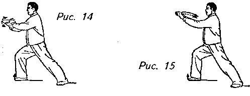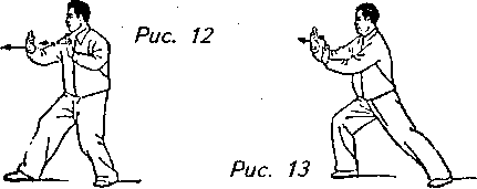 Движение 6: Отведите левую руку немного назад к внутренней стороне правого локтя, затем обеими руками надавите вперед, правой ладонью к себе, а левой от себя. В этот момент медленно перенесите центр тяжести своего тела на правую ногу, переходя на левый “шаг вдоль кромки радуги”. Взгляд следует обратить на локоть правой руки. Это движение называется “стискиванием” (рис. 12, 13)..