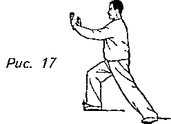 Движение 8: Вытолкните обе руки вперед и вверх, вывернув их ладонями от себя так, чтобы запястья оказались на уровне плеч. Во время выполнения этой части упражнения перенесите вес своего тела на правую ногу, переходя на правый “шаг вдоль кромки радуги”. Взгляд по-прежнему устремлен прямо вперед. Это упражнение называется “толкающим” движением (рис. 17).