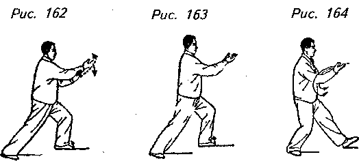 Движение 1 (продолжает рис. 161): Вытяните левую руку под правым запястьем ладонью вверх, распрямите правую ладонь, направив ее поверхность тоже вверх, а затем медленно разведите руки по закругленной траектории в разные стороны на уровне груди. Одновременно с этим согните правое колено, отклонитесь немного назад, слегка приподнимая носок левой ноги и перенося тяжесть тела на правую ногу. Взгляд обращен прямо вперед (рис. 162, 163, 164).