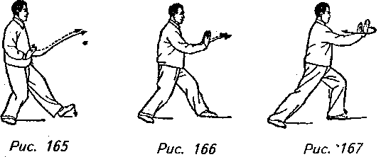 Движение 2: Когда обе ладони окажутся непосредственно около вашей груди, поверните их вниз и опустите до уровня живота, затем вытолкните их вперед и вверх так, чтобы запястья оказались на уровне плеч. Ладони обращены вперед. Одновременно с этим перенесите вес своего тела на левую ногу, переходя на левый “шаг вдоль кромки радуги”. Взгляд при этом должен быть обращен на пространство между ладонями (рис. 165, 166, 167).