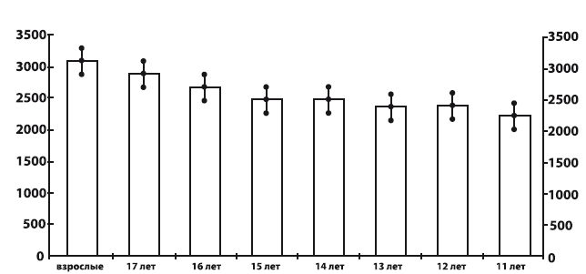 Рис. 18. Средние результаты в тесте Купера, показанные польскими футболистами различного возраста