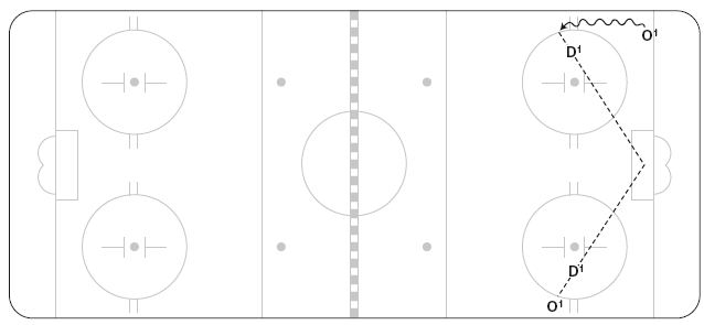 В молодежных матчах нередко за владеющим шайбой игроком отправляются двое оппонентов, не замечая, что другой уже принял на себя опеку. Как только игроки осознают важность удержания позиции в центре, они не будут так стремиться к резкому переходу. Оказывать силовое давление на владеющего шайбой игрока, чтобы ограничить его во времени и пространстве, очень важно, но делать это должен только один человек.