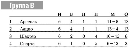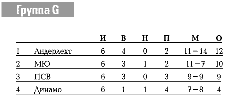 В группе Н «Барселона» в первом же туре разнесла «Лидс» 4:0, но весь пар вышел у каталонцев в этот свисток, и явно хромающая команда в итоге отправилась в Кубок УЕФА с третьего места. Вот как вам такая последовательность результатов: «Барса»-«Лидс» — 4:0, «Бешикташ»-«Барселона» — 3:0, «Лидс»-«Бешикташ» — 6:0, «Барселона»-«Бешикташ» — 5:0?! Первенствовал же ровно прошедший дистанцию «Милан», Шевченко забил победный мяч «Бешикташу» в Стамбуле. В последнем туре «россо-нери», как они всегда поступали, решив свои задачи, позволили сопернику добиться нужного результата — «Лидс» сыграл на «Сан-Сиро» вничью 1:1 и на очко опередил «Барсу»!