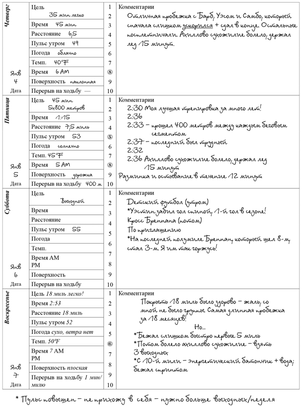 При использовании дневника, специально разработанного для бегунов, вам не приходится задумываться, где и что записывать. Графы на странице требуют определенной информации, и вы быстро научитесь заполнять их. Это дает вам возможность заполнить свободное место какими-нибудь творческими мыслями и идеями, возникшими во время пробежки. Рассмотрите доступные варианты дневников и выберите самый простой в использовании, который удобно носить с собой. Ниже предлагаю образец страницы моего тренировочного дневника (доступен на www.JeffGalloway.com).