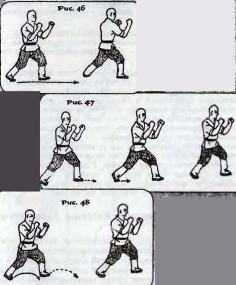 Сначала делает короткий шаг нога ближайшая к направлению движения: вперед — передняя, назад — задняя, вправо — правая, влево — левая. Затем подтягивается другая нога. Обе ноги движутся быстро, почти одновременно (рис. 47).