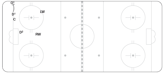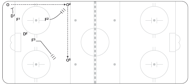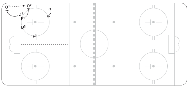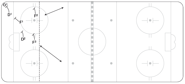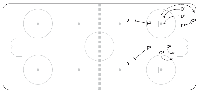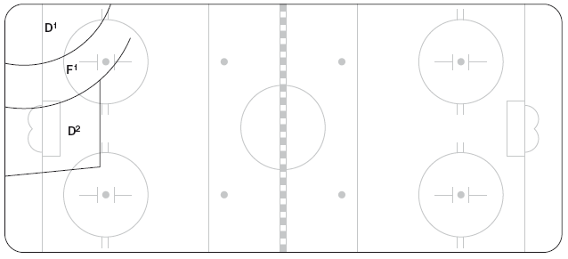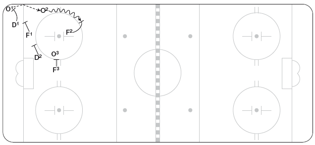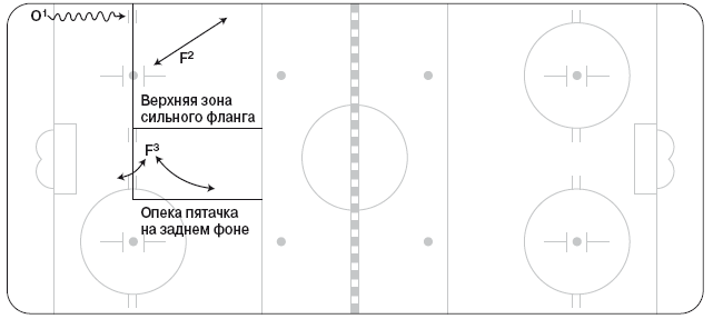 Если у защищающейся команды трое игроков в дальнем углу, то самым важным элементом вблизи шайбы являются действия F3. Он охраняет пятачок, а также прикрывает сильный фланг. F3 не должен забывать о третьем форварде и опеке любого игрока, который выезжает к воротам, в то же время осматриваясь, не входит ли оттянутый защитник в голевую зону. Последний попытается проникнуть на задний фланг, поэтому F3 должен не терять бдительности и быть наготове. F2 блокирует защитника сильного фланга, играя значительно ближе к борту, перекрывая таким образом пас на внешний край в угол у синей линии со стороны сильного фланга. F2 должен начинать действия от внутренней части круга, а затем выдвигаться, чтобы отсечь игроков, разворачиваясь вдоль борта и активно используя клюшку, чтобы предотвратить пасы в угол у синей линии.