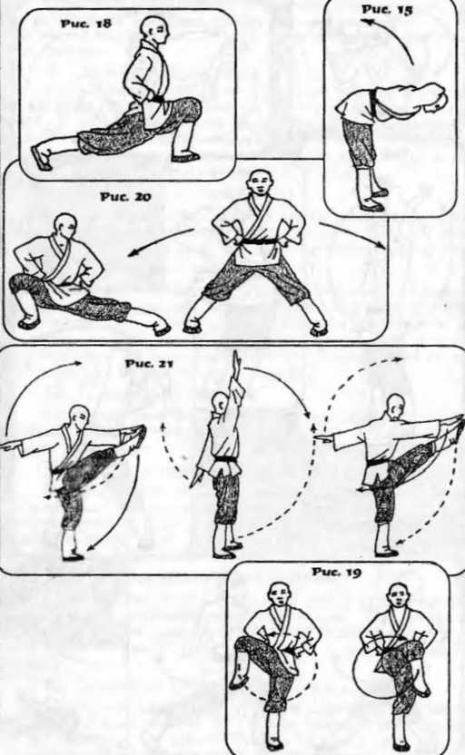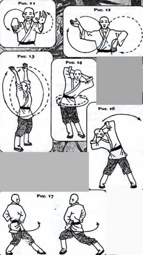 Ступни на расстоянии чуть большем ширины плеч, кулаки на поясе; повороты туловища из стороны в сторону, перенося вес тела с одной ноги на другую: 30—40 поворотов в каждую сторону. Ступня опорной ноги остается неподвижной, а пятка другой ноги разворачивается в сторону поворота туловища (рис. 17). Ци сосредоточена в пояснице.
