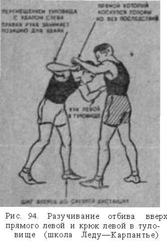 пассивным защитам, хотя при известной ловкости и может быть использован для немедленного перехода в отчетную контратаку крюком правой в голову, тем более, что вес тела уже перенесен на правую ногу.