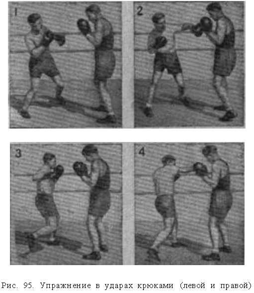Изучается комбинация в парах, в атакующей и ответ ной формах. К этому же времени и приурочивается изучение описанных защит отходом назад с подставкой левого плеча и нырком влево под удар правой.