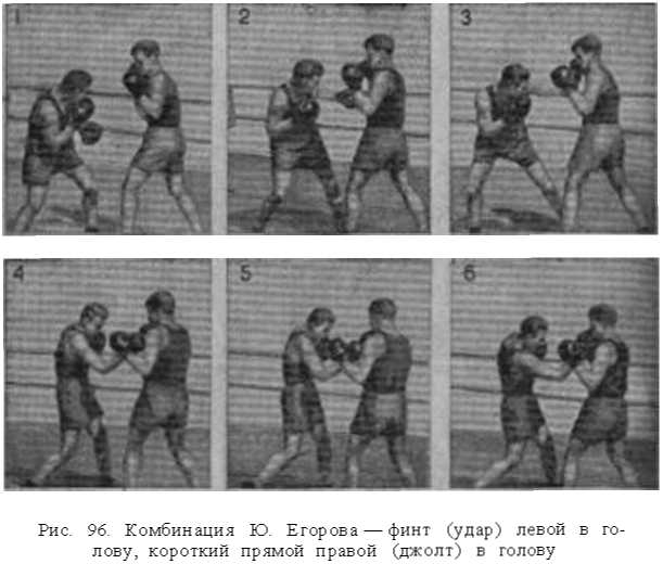 Вслед за этим крюк левой в туловище заставит противника защищаться подставкой правого локтя и ослабить внимание к защите головы. Поэтому следующий за этим акцентированный удар правой рукой в голову должен беспрепятственно попасть в цель.