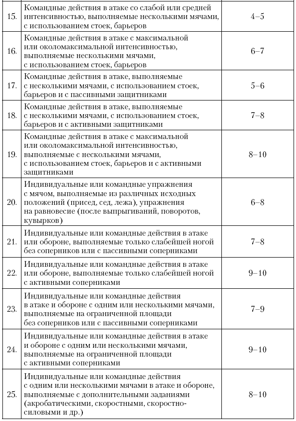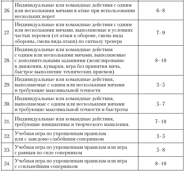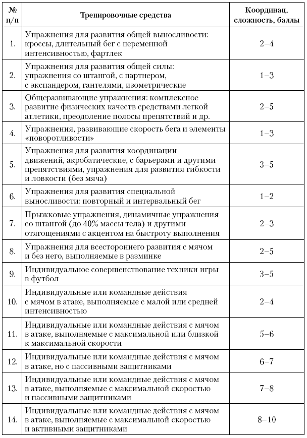 Анализ тренировочных планов, а также личные наблюдения за тренировочными занятиями футбольных команд различного уровня подготовленности показывает, что тренеры не планируют и не проводят систематического контроля тренировочных нагрузок с точки зрения интенсивности, объема и направленности воздействия. Поэтому, помимо классификации упражнений, нами использовалась дополнительная оценка тренировочных средств с точки зрения их координационной сложности. С этой целью была разработана матрица, где все упражнения были расположены в соответствии с их координационной сложностью (табл. 45). Такой подход применялся для анализа каждого тренировочного занятия микроцикла, мезоцикла и т. д., следующим образом: