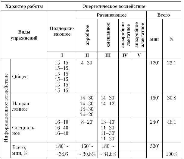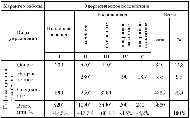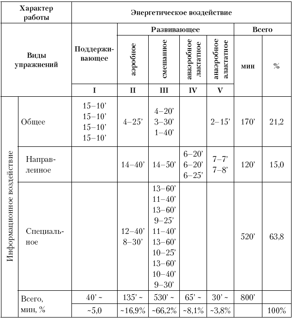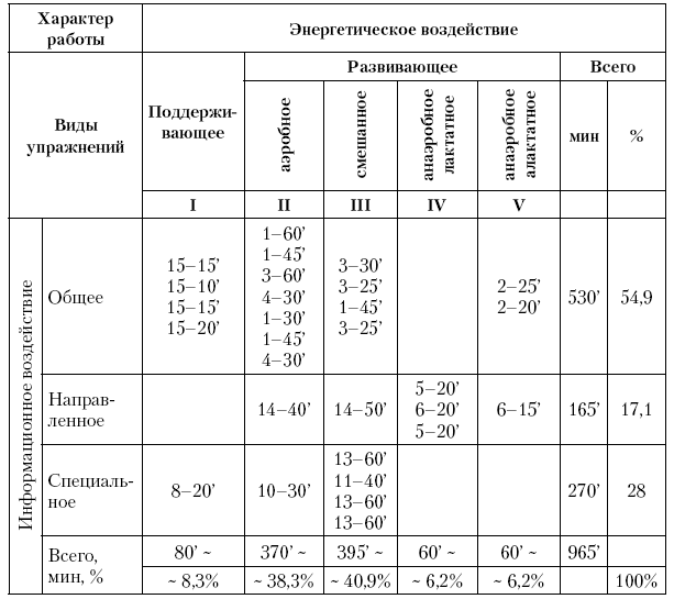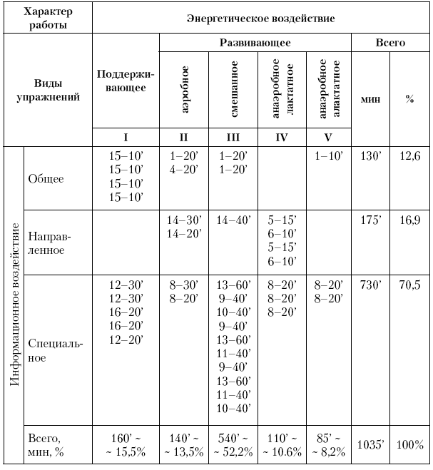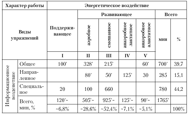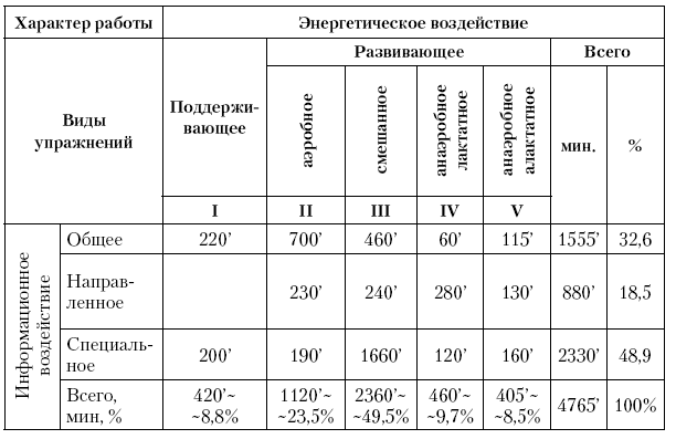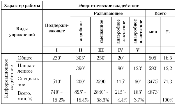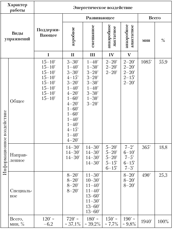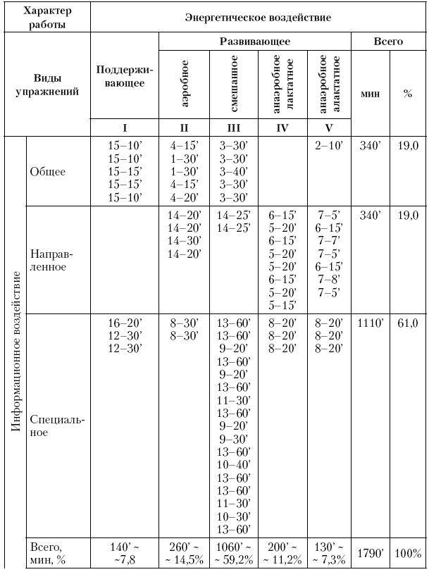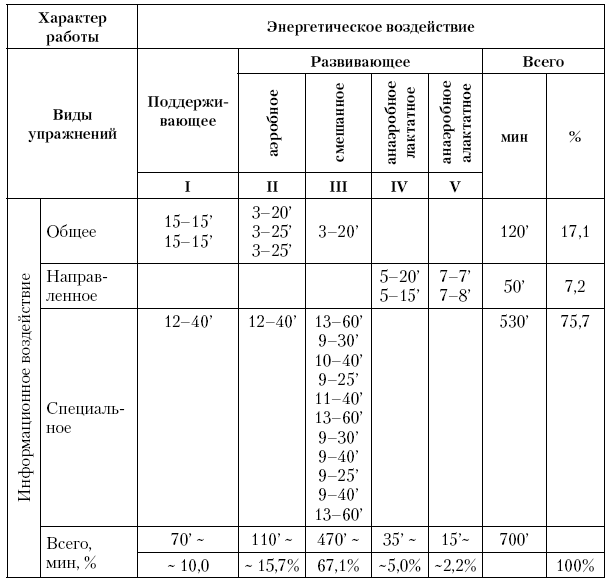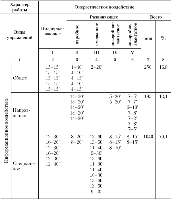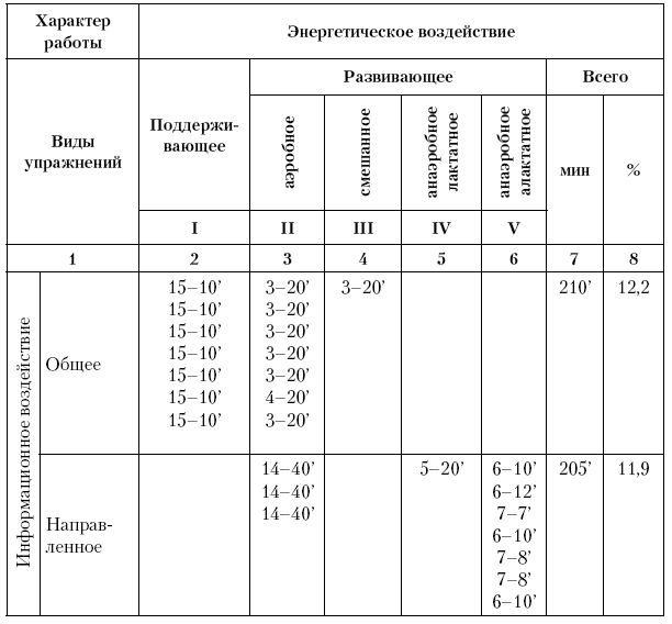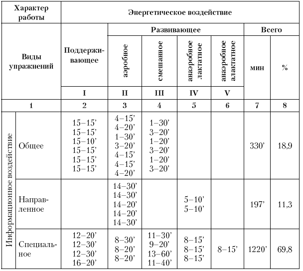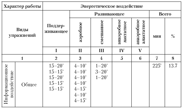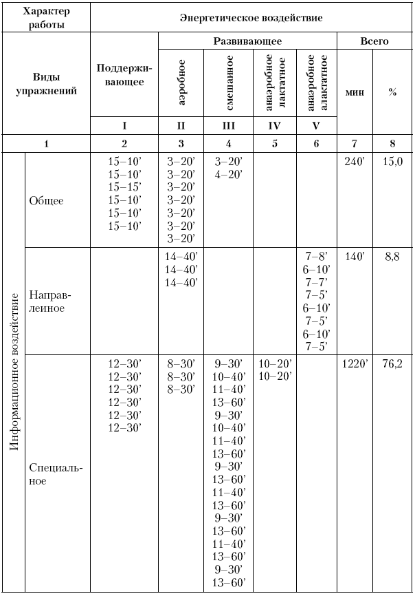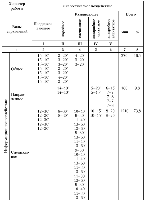 Используя три направления воздействия тренировочных средств (всестороннее, целенаправленное, специальное) и пять степеней интенсивности работы (нагрузки поддерживающие, аэробные, аэробно-анаэробные, анаэробно-лактатные и анаэробно-алактат-ные), можно измерять тренировочные нагрузки путем суммирования «чистого» времени работы в отдельных «информационных», «энергетических» сферах. Такой материал дает возможность его анализа, получения информации о величинах нагрузок на различных этапах тренировки в мезоциклах, микроциклах или отдельных тренировочных занятиях.