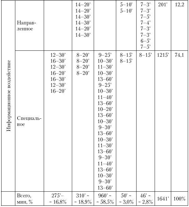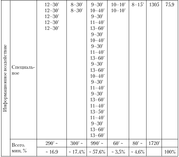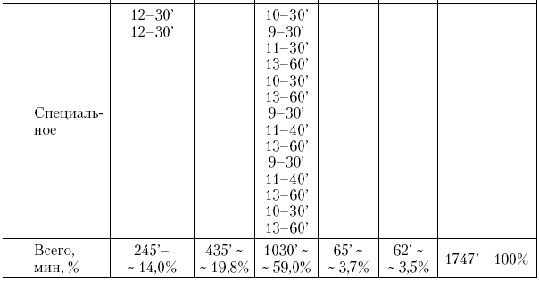 В информационном аспекте суммарное время отдельных видов упражнений составляло: