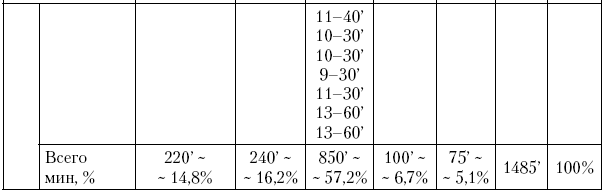– анаэробные лактатные упражнения – 125 мин (7,1 %),