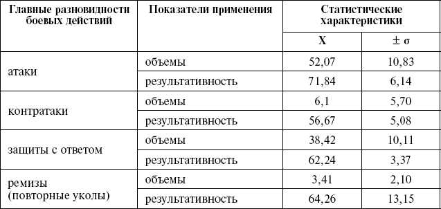 Например, в фехтовании подсчитаны в процентном соотношении объем и результативность соревновательных действий высококвалифицированных мужчин-рапиристов. Эти данные сведены в таблицу, которая приводится ниже (71).