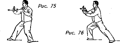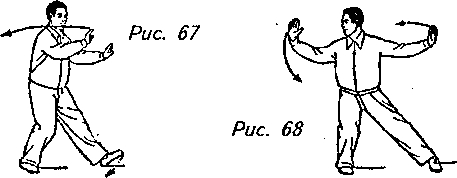 Указание: Когда вы будете выталкивать ладони вперед, верхняя часть вашего тела должна быть приподнята, а поясница и бедра расслаблены. Толкающее движение рук обязательно надо согласовывать с расслаблением поясницы и сгибанием ноги. Обе ладони должны двигаться по искривленной траектории, а руки — полусогнуты, образуя дуги.