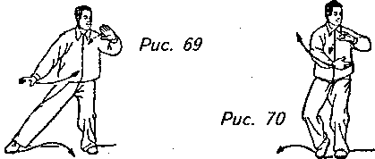 Движение 1 (продолжает рис. 66): Отклоните верхнюю часть корпуса назад, перенесите вес своего тела на правую ногу, затем поверните корпус направо и передвиньте кончики пальцев левой ноги немного вовнутрь. Во время выполнения этой части упражнения пусть ваша правая ладонь пропутешествует по кривой подальше вправо, а затем вниз и поперек живота налево к конечной остановке около нижней границы левых ребер с ладонью, направленной вверх; при этом должна воспроизвестись поза человека с мячом в правой руке. Одновременно с этим перенесите вес своего тела на левую ногу, отведите правую стопу к левой, удерживая кончики пальцев ее на полу. Взгляд направлен на левую ладонь (рис. 67-70).