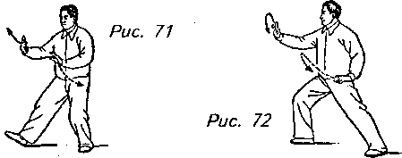 Движение 2: Сделайте правой ногой шаг вперед и перенесите на нее вес своего тела, переходя на правый “шаг вдоль кромки радуги". По завершении этого действия передвиньте правую руку сначала вперед, потом ладонь переместите назад и вправо на уровне плеча, при этом ладонь должна быть направлена к вашей груди, а локоть чуть согнутым, как если бы вы отражали внезапную атаку. Одновременно с этим опустите левую руку к левому бедру, удерживая ладонь направленной вниз. Взгляд нужно направить на правую руку, выдвинутую вперед (рис. 71, 72).