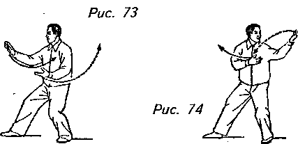 Движение 3: Выведите правую руку вперед с ладонью, направленной вниз, переместите левую руку по диагональной кривой над животом до запястья правой руки, держа левую ладонь направленной вверх; затем обе руки должны передвинуться по искривленной траектории назад, вниз и вверх, влево до тех пор, пока левая рука не окажется на уровне плеч, ладонь направлена вверх; правая рука должна находиться прямо перед грудью с ладонью, обращенной к телу. В этот момент медленно перенесите центр тяжести на левую ногу. Взгляд направлен в сторону левой руки (рис. 73, 74).