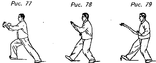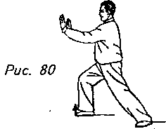 Движение 5: Разведите руки в стороны приблизительно на ширину плеч, держа кисти внутренней стороной вниз, отклоните верхнюю часть корпуса назад и перенесите вес своего тела на левую ногу, отрывая кончики пальцев правой ноги от земли. Одновременно отведите обе руки по обе стороны груди, держа кисти внутренней стороной от себя под углом 45°. Взгляд теперь устремлен вперед (рис. 77, 78, 79).