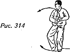 Движение 1(пр. рис. 313): Согните немного колено левой ноги, перенесите на нее центр тяжести и отодвиньте правую ногу назад к левой ступне, упираясь носком в землю. Одновременно с этим выверните правый кулак (тыльной стороной вверх) и опустите его вниз, влево и, проведя по кривой мимо живота, остановите под левыми ребрами. Немного назад подвиньте и левую ладонь, чтобы она оказалась перед грудью и была обращена ладонью вниз (рис. 314).