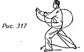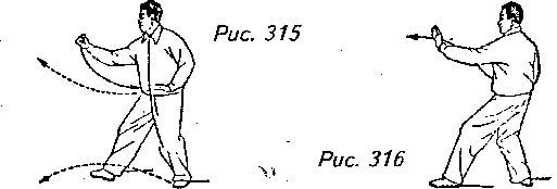 Движение 3: Перенесите центр тяжести на правую ногу, отодвиньте правый кулак к правому боку в области поясницы тыльной стороной кулака вниз. Теперь нужно выдвинуть левую ладонь от левого бока, словно останавливая встречный удар. Одновременно с этим шагните вперед левой ногой и перенесите на нее вес тела, переходя к левому “шаг вдоль кромки радуги”. Во время выполнения этой части упражнения вытолкните правый кулак на уровне груди вперед (ямка, образованная большим и указательным пальцами, направлена вверх), а левую ладонь перенесите к внутренней стороне правого предплечья. Взгляд в данный момент должен быть направлен в сторону правого кулака (рис. 317).