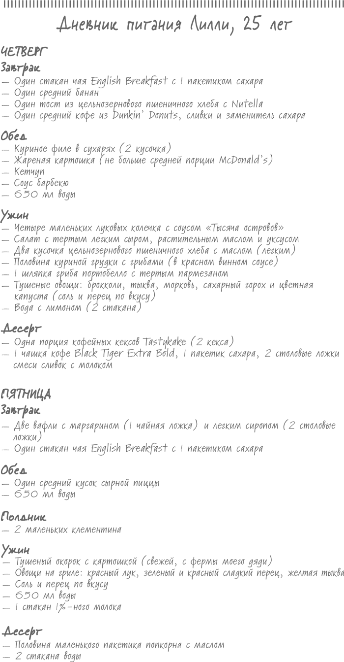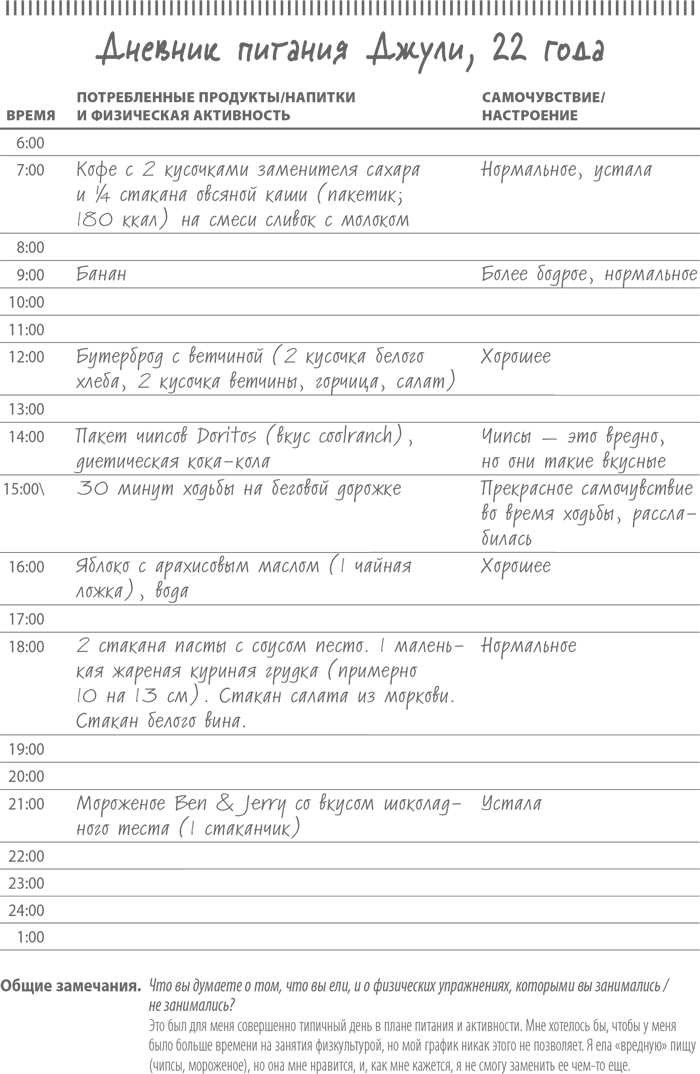 Итак, давайте предположим, что Джули и Лилли дали точный отчет о своем рационе. Что бы вы могли посоветовать им изменить в их питании для улучшения здоровья? Заметили ли вы какие-нибудь «красные флажки», относящиеся к выбору вредной пищи, в их дневниках? Какие блюда из выбранных девушками кажутся вам полезными? Не хочется ли вам включить что-нибудь из них в свой рацион? (Я, например, узнала от Джули, что яблоки прекрасно сочетаются с арахисовым маслом!) Более детально мы поговорим о том, как оценить ваш дневник питания, в главе 5, но иногда я замечаю, что при оценке чужих дневников легче проявлять объективность. Поэтому знакомство с этими примерами и мысли о том, как можно улучшить данный рацион, могут оказаться для вас полезными.