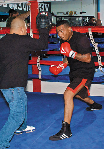 Бой с тенью. 3 раунда с 15-фунтовыми отягощениями (7 кг); 2 раунда без отягощений.