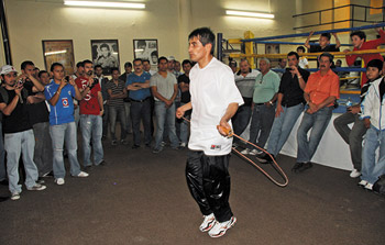 Скакалка. 20 минут (при работе со скакалкой Али всегда двигался по залу: вперёд, назад, по кругу, смешивая различные движения, никогда не прыгая на одном месте).